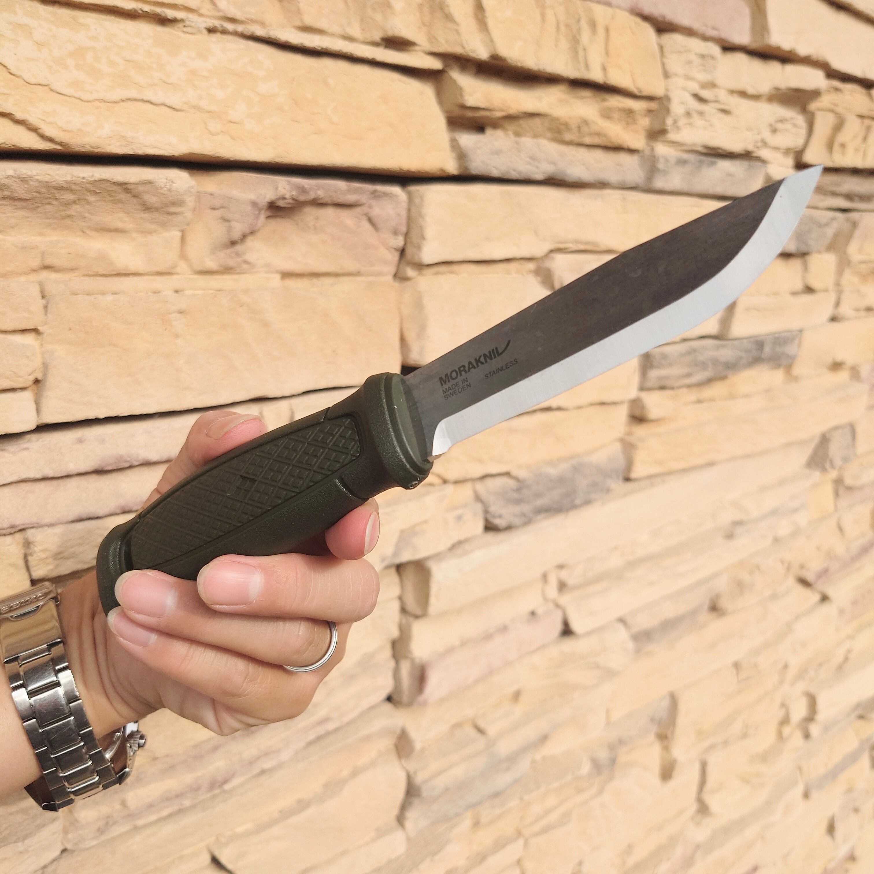 モーラナイフのアウトドアナイフ全ラインナップのなかで、最も強靱で重量感のあるハイエンドモデル。ブレードは刃厚3.2mmのフルタング(鋼材がグリップエンドまで通っている)構造になっており、非常に耐久性が高いモデルとなっています。また、高品質のステンレススチール製のブレードはスウェーデン Alleima(旧Sandvik)製のステンレス鋼を採用。近年では、ステンレス製品のほとんどがリサイクル合金を使用し、モーラナイフの鋼も80%以上がリサイクルされたスウェーデン鋼からなる合金で作られています。そのステンレス鋼材を、モーラナイフ自社工場でこだわりの製法で製造し十分な耐久性を持った鋼材を生み出しています。また、切れ味の鋭い刃はスカンジナビアンスタイルの特徴的な形状となっています。