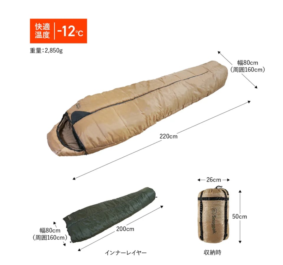 ●2枚の寝袋を重ねて使うレイヤー仕様、1枚で使うこともできるため-3つの温度帯(3℃/-2℃/-12℃)に対応可能。