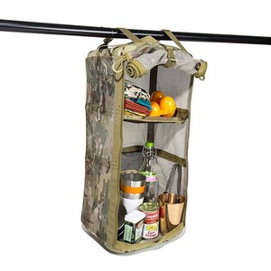 吊して収納する縦型収納棚、キャンプシェルフです。仕切りは収納内容に応じて1~3室へ可変、本体を畳めば厚さは僅か8cm。フロントシェードを閉じると、蚊帳(かや)代わりとしても使えます。洗った食器や余った食材などを保管するのに便利。キッチン回りやテント内で活躍する、便利アイテムです。