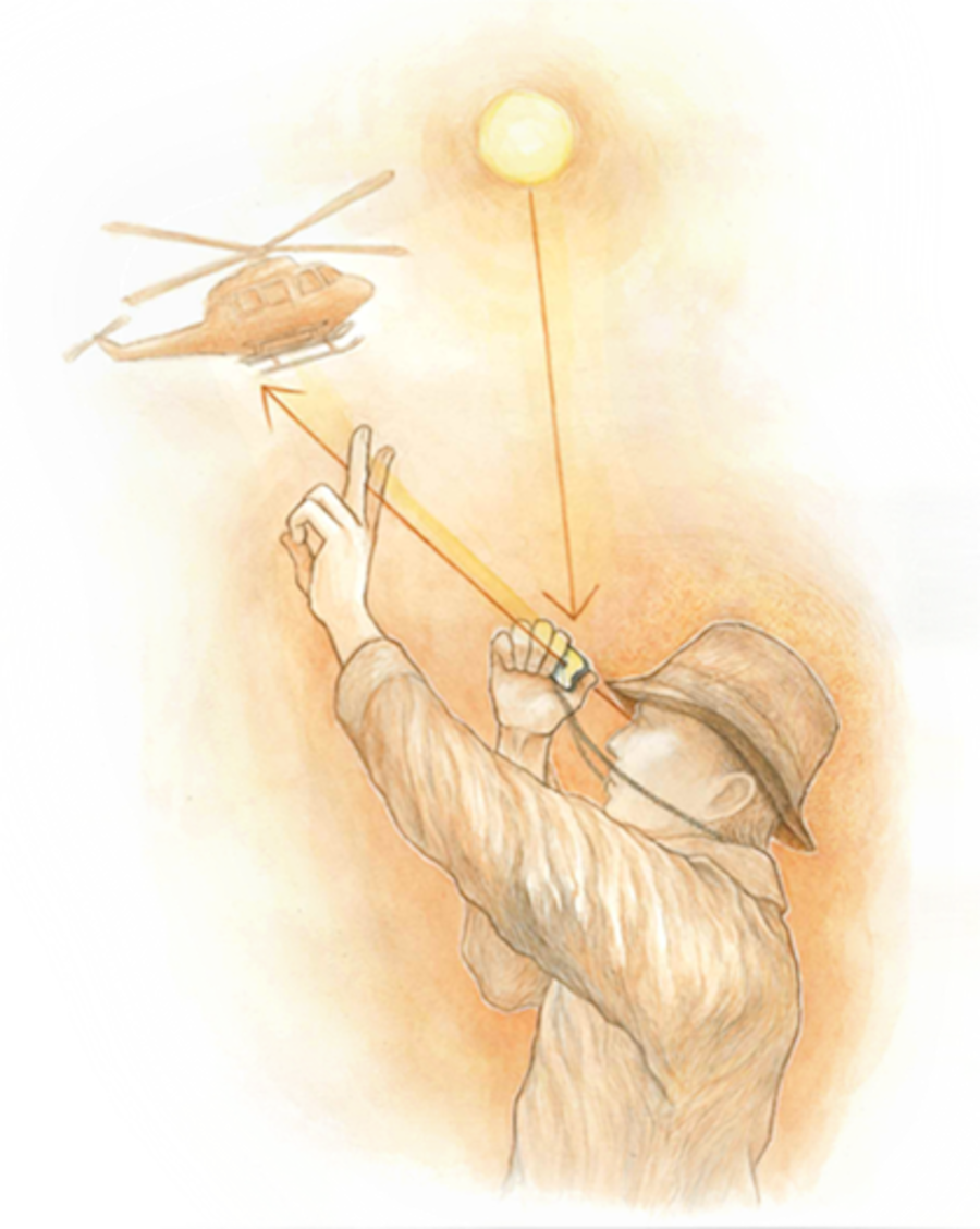 ペンダント、指、対象、の3点の直線上に光が来るように、指に当たる太陽光を基準に微調整してください。