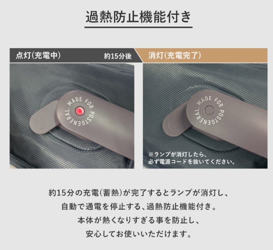 蓄熱後はコードレスで持ち運べるため、布団の中やリビングでのリラックスタイム、車やアウトドアなど様々なシーンでお使いいただけます。