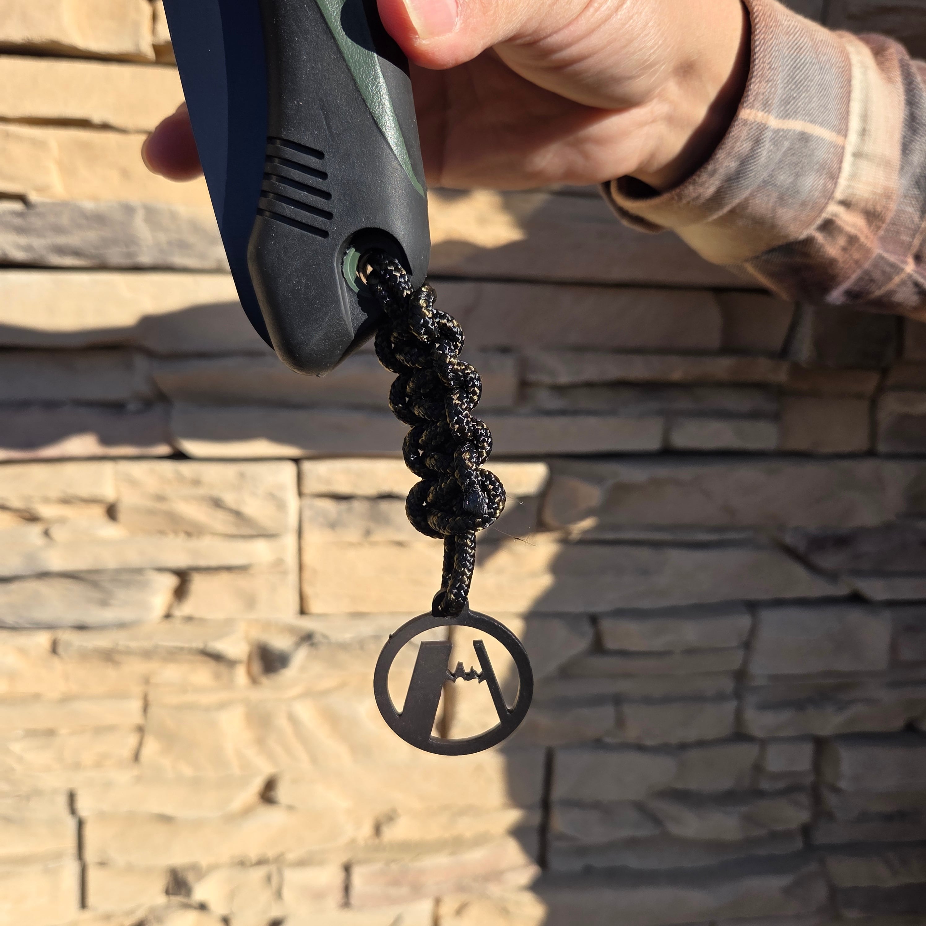 フジノハガネで販売するBlackJawsにだけ、『ハ』マークのチャームが備前紐で取り付けられており、ブレードにロゴマークが刻印されています。