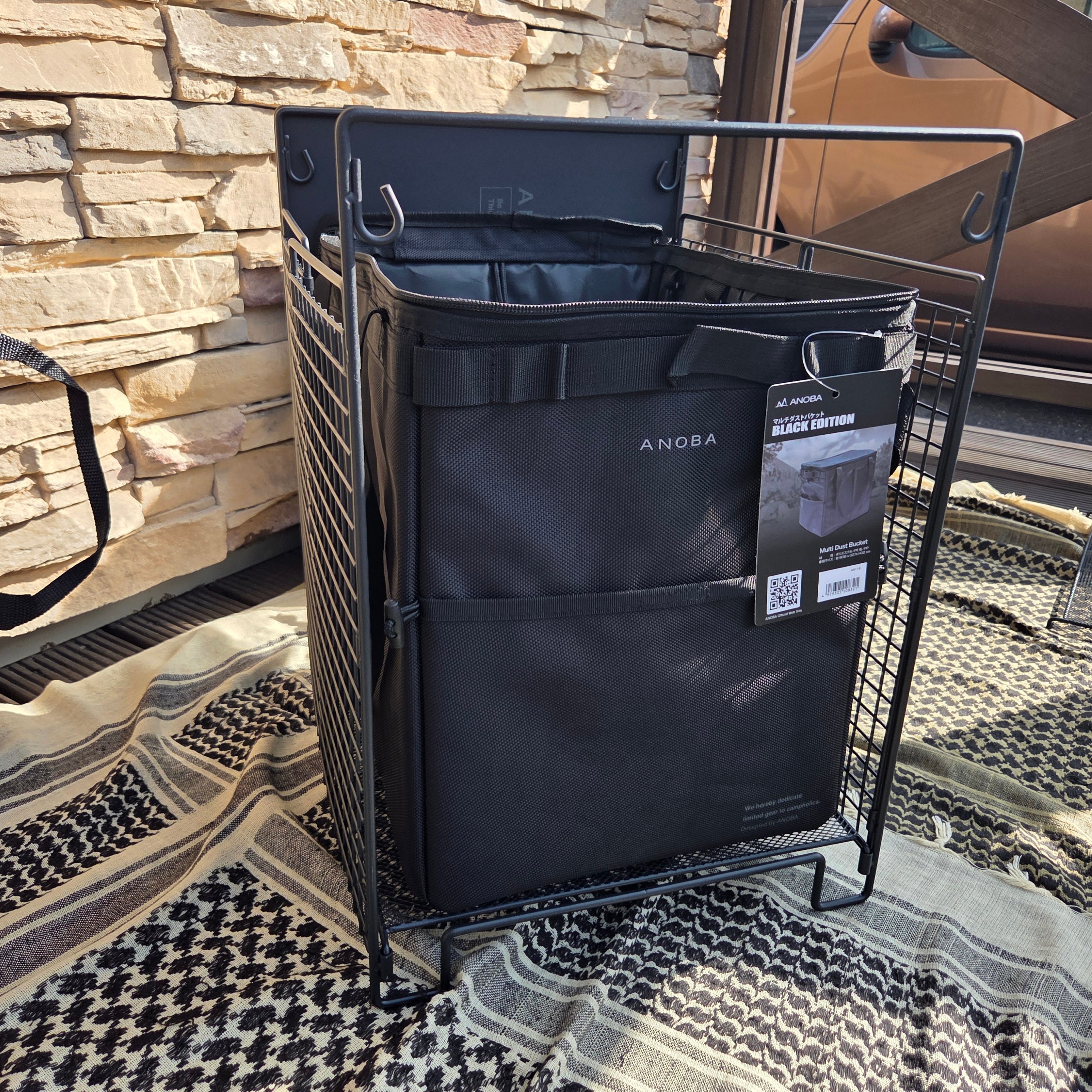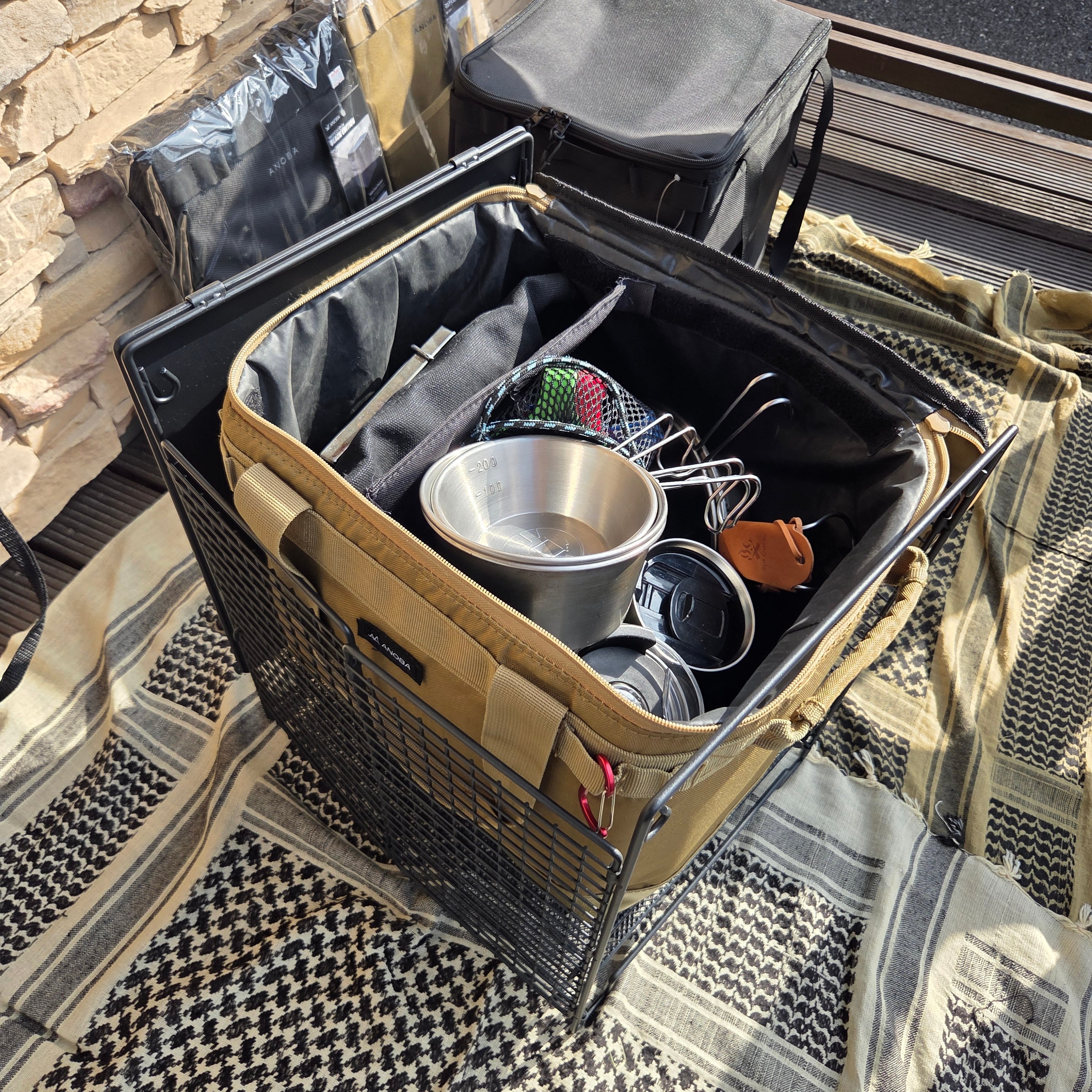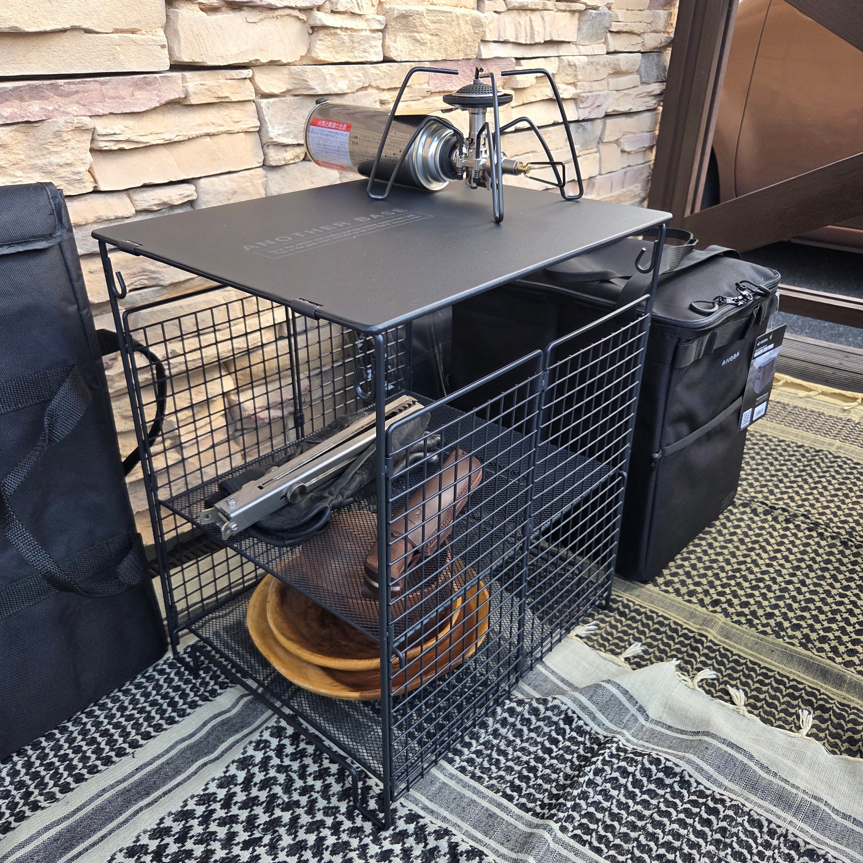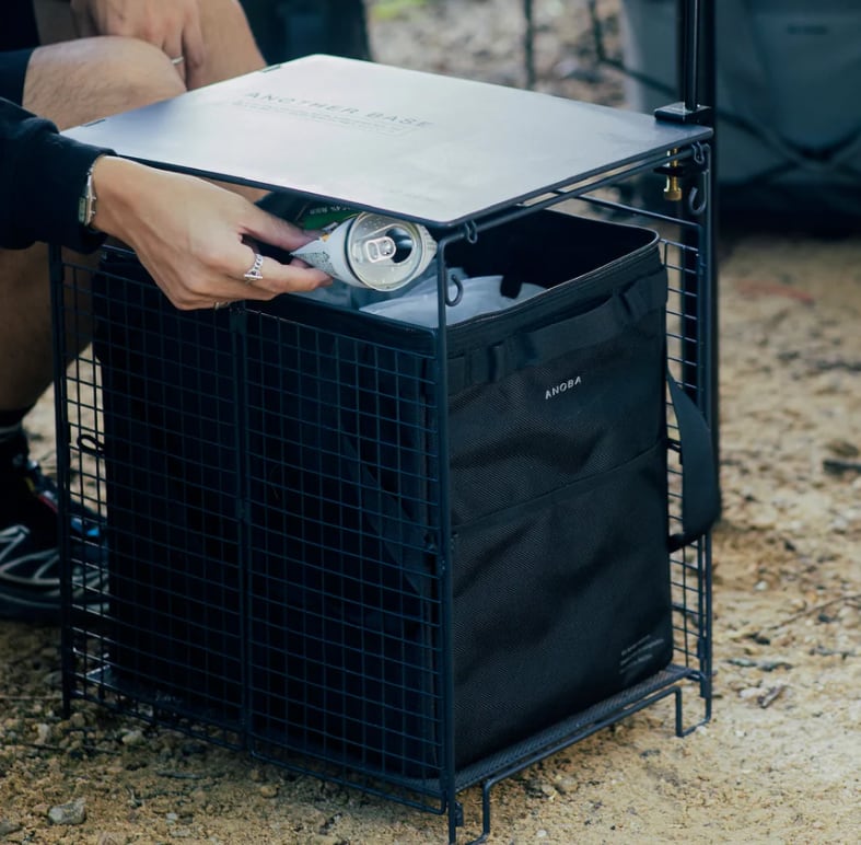 ギアバッグ類の収納ラックにも使え、マルチダストバケット( 別売) と組み合わせてスタイリッシュなルックスのゴミ箱に。天板とゴミ箱の間に手が入るスペースを設けて、ゴミ箱へのアプローチもスマートに。
