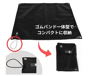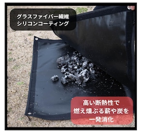 〈ハトメ加工、ゴム収納〉 4つ角にハトメ加工をしているため、ペグダウンができ、強風でも安心して活用できます。また、強めのゴムがついているため、収納もコンパクトのまとまります。 【高耐熱素材、防水性、お手入れ】 材質はグラスファイバー繊維シリコンコーティングを施してあります。高い断熱性を発揮し、熱い燃え燻ぶる薪や炭を入れることができます。また防水性があるため、使用後は水洗いで簡単お手入れできます。