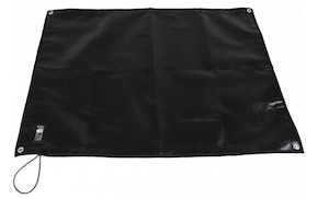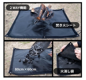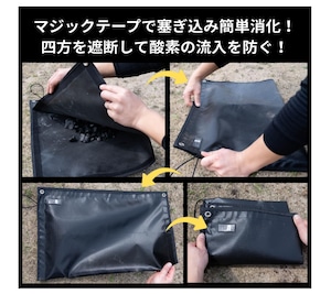 〈スパッタシート兼、火消し袋〉グラスファイバー繊維でシリコンコーティングされており耐熱性・難燃性の生地で作られており、スパッタシートとして活用した後に、外周のマジックテープで塞ぐ混むことで、シート内の炭や燃えカスを酸欠状態にして鎮火することができます。