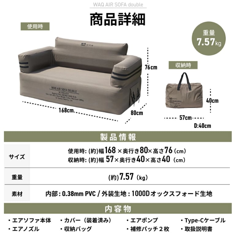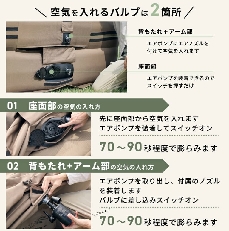 ■セット内容 ソファ本体/エアポンプ/エアポンプ用充電ケーブル(USB Type-C)/エアポンプ用先端ノズル/補修パッチ2枚/収納袋/取扱説明書