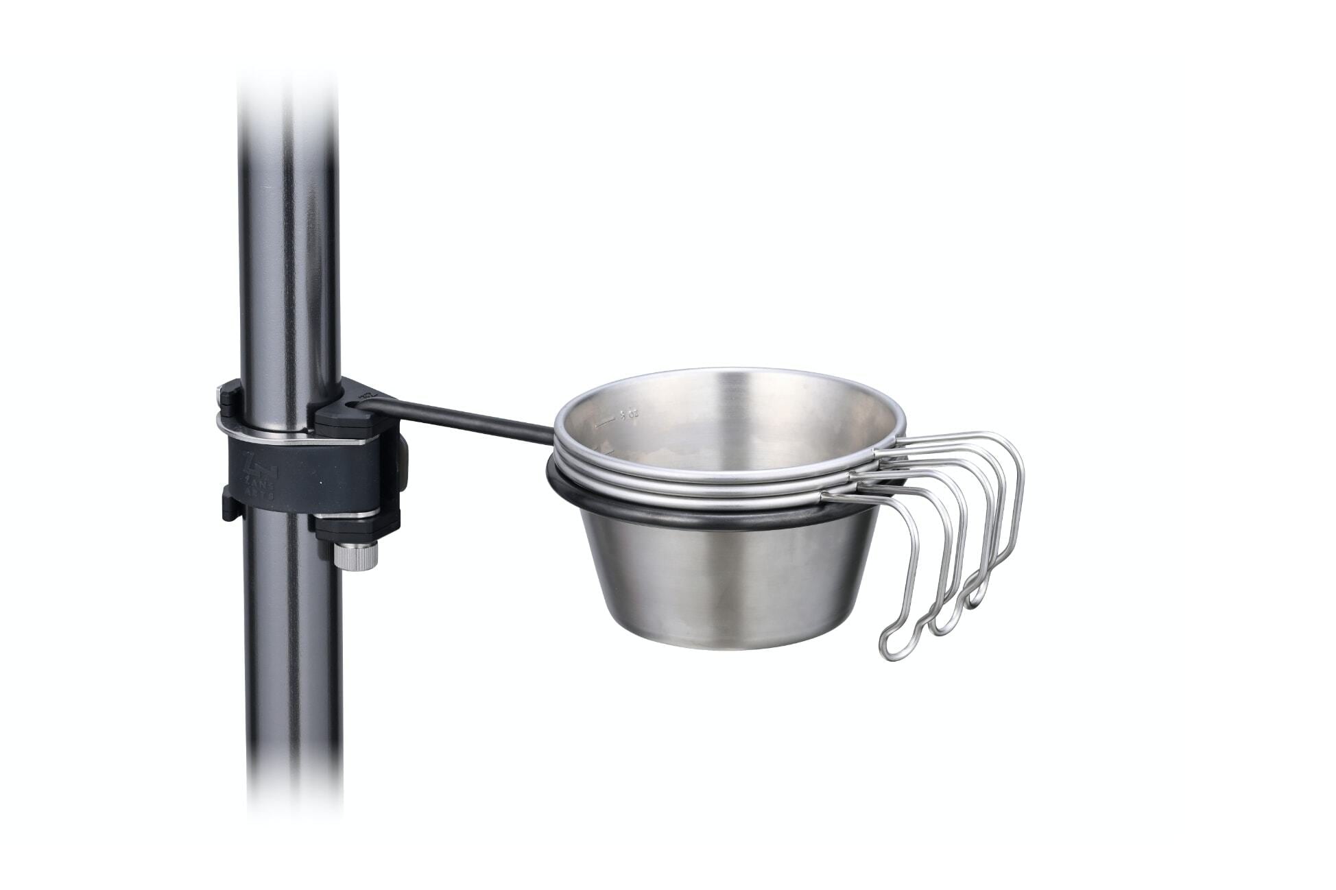 タープやシェルターのポールにセットできるカップ用ホルダー。シェラカップの他、タンブラーにも対応。