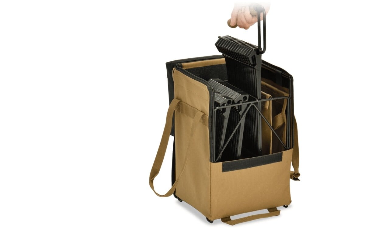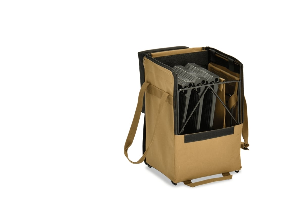 自動車での運搬時は、ラックを倒す事で振動によるペグどうしの接触音を抑制します。運搬時のペグの飛び出しを防ぐためのパッドも、内側の上面に付いていますので安心です。