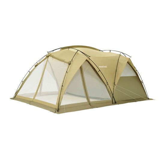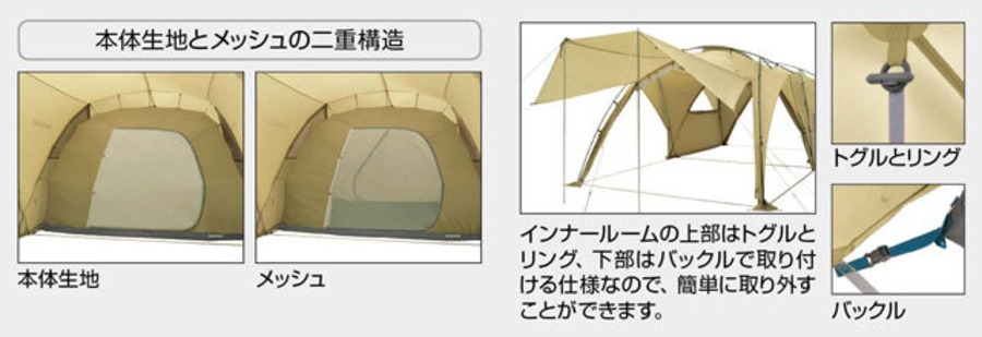 4名が快適に過ごすことができるインナールームが付属します。4方向全てが本体生地とメッシュとの二重構造なので、季節に合わせて通気性の調節が容易に行えます。また、インナールームを取り外して大型自立式タープとして使用できます。