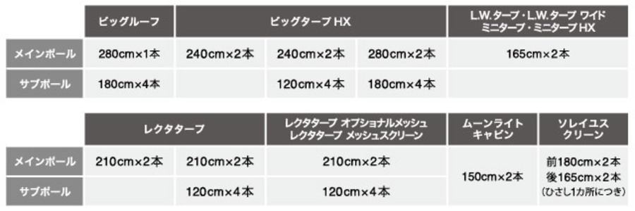 メインポールとサブポールを組み合わせる場合(オプショナルメッシュ、メッシュスクリーンを使用する場合):210cm×2本、120cm×4本