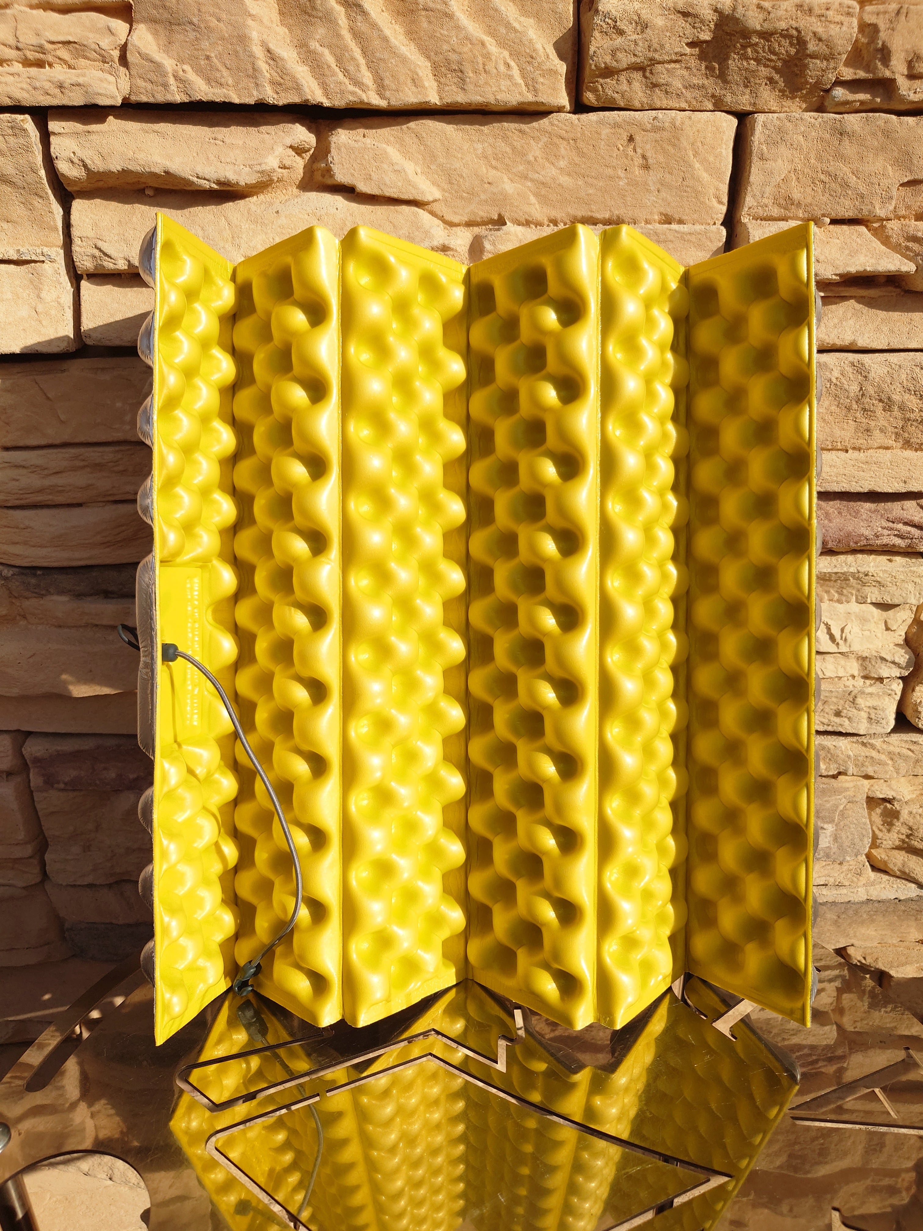 パンクとは無縁のクローズドセルの座布団。アルミ蒸着されているので断熱性に優れています。アコーディオン状に小さく折りたたみ可能。収納に便利なバンジーコードが付いています。